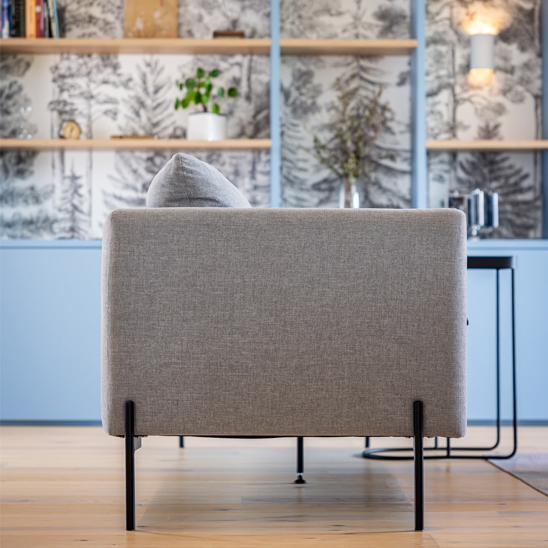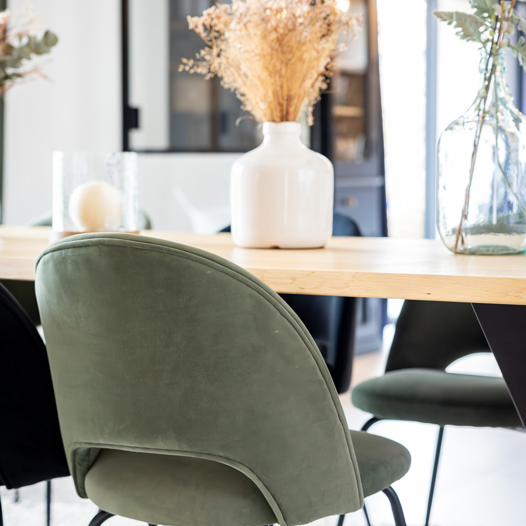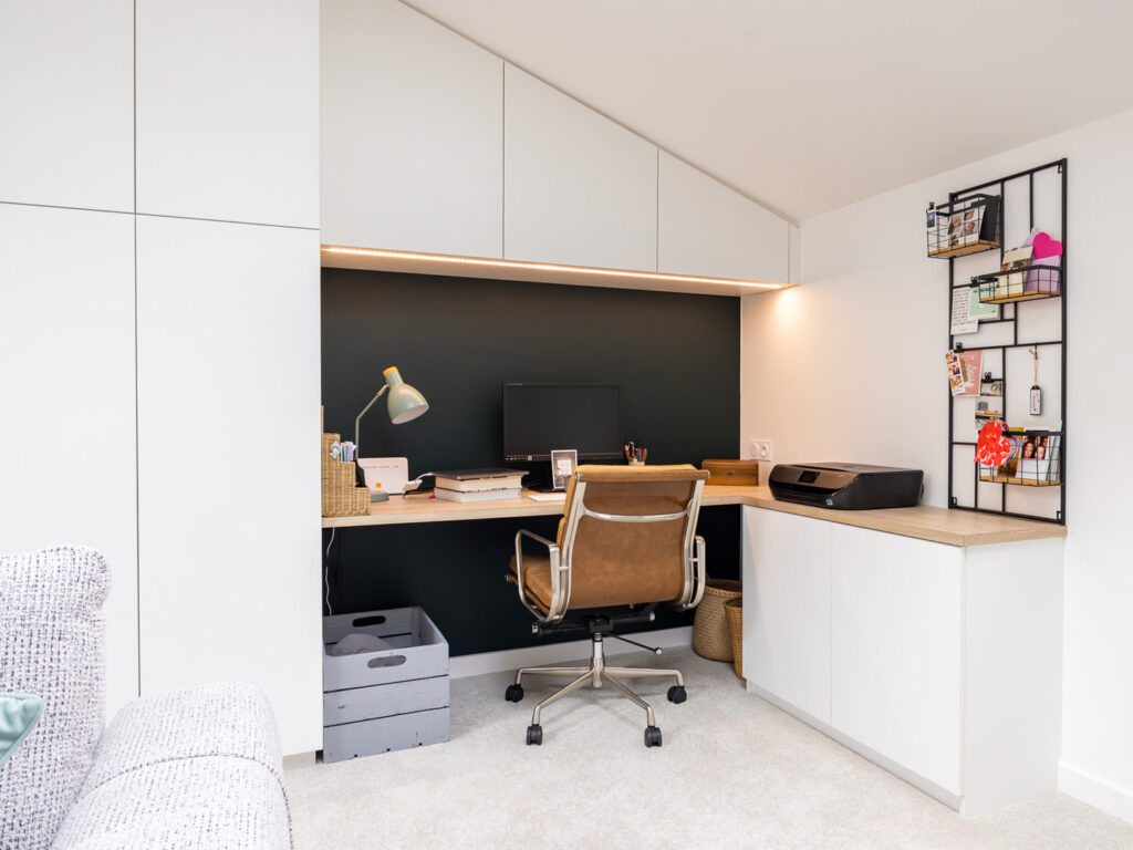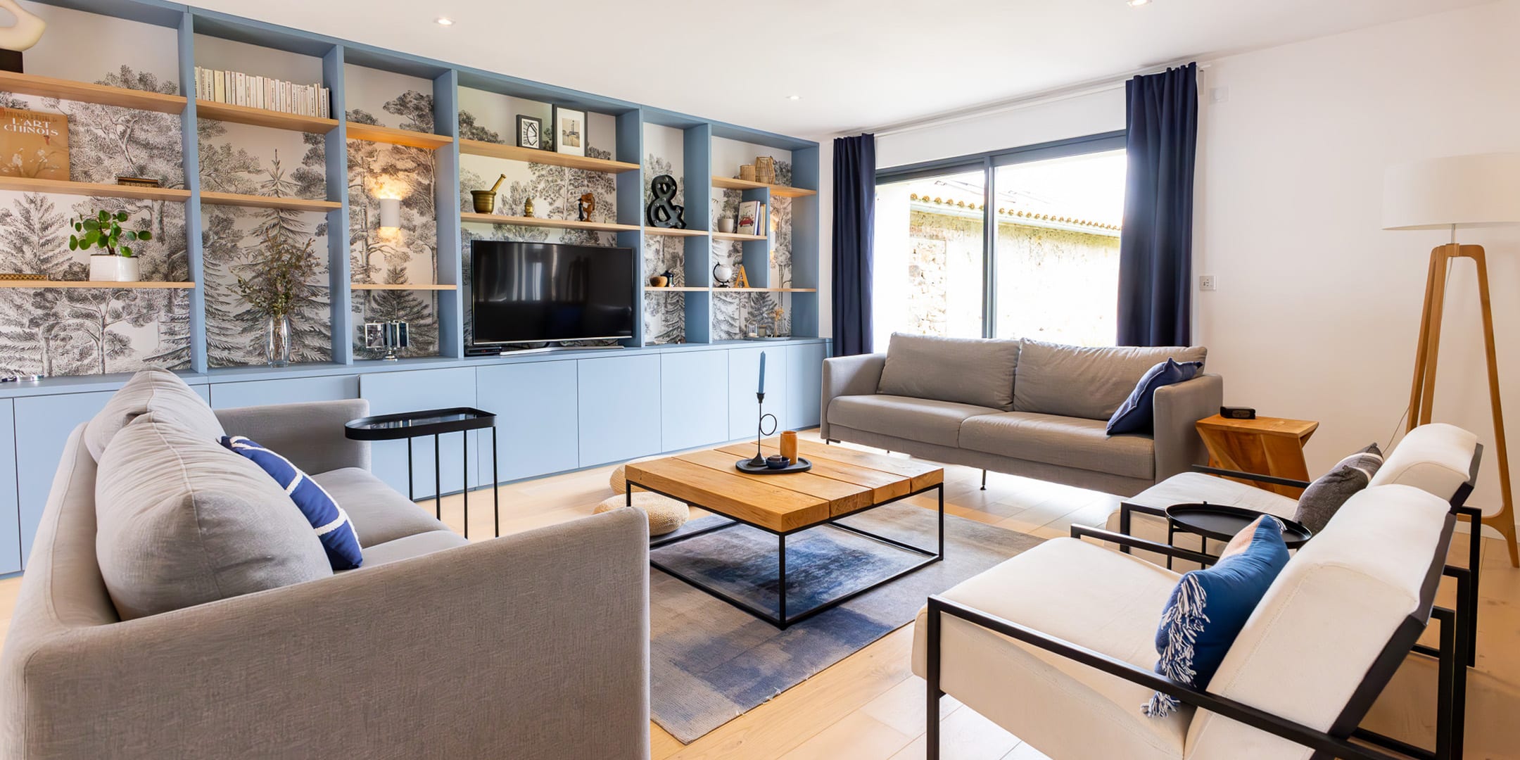 Dans ce projet d’aménagement, l’enjeu était de structurer une vaste pièce de vie à la hauteur sous plafond généreuse, en lui insufflant une identité claire et contemporaine. Nous avons introduit un claustra en bois, véritable élément architectural, pour définir le salon TV et le distinguer de la salle à manger. Un jeu de tapis au sol vient matérialiser l’espace repas, tandis qu’une verrière contemporaine cloisonne élégamment la cuisine, créant ainsi des zones distinctes mais harmonieuses. L’ensemble compose un intérieur où design et fonctionnalité se rencontrent, offrant à chaque espace sa propre personnalité..